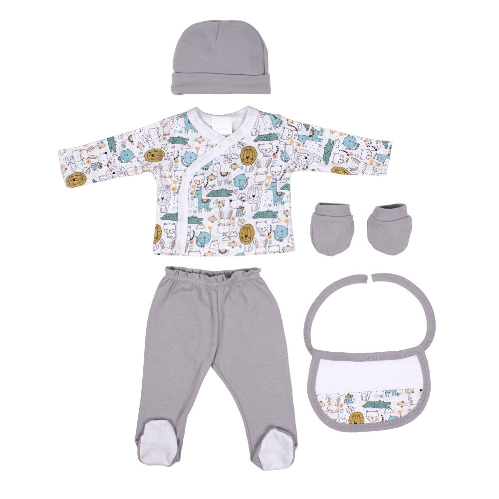 Set MI PRIMERA PUESTA 5 piezas animalitos grises 100% algodón