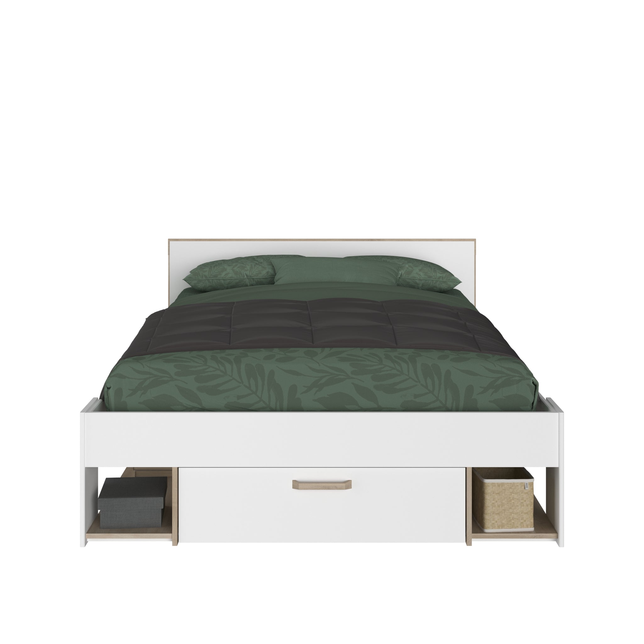 MDF laminado color oak/negro. Mide externamente146cms ancho x 205cms profundidad x 77cms alto. Usa colchón de medida full standard americano. Colchón se vende x separado. Incluye 3 cajones y nichos debajo de la cama. Cajones con riel.